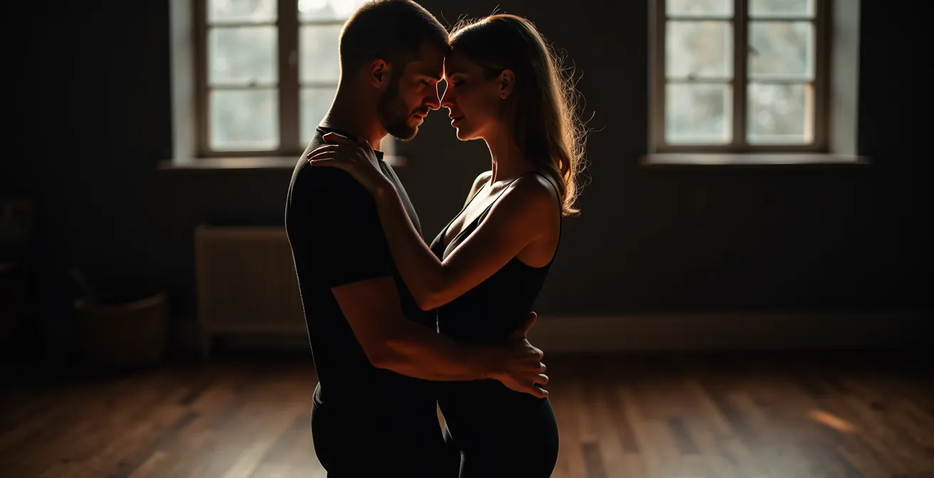 Si la danse blues est une conversation, l’étreinte ou « close embrace » en est le canal de communication principal. C’est bien plus qu’une simple prise de contact physique ; c’est un état d’écoute active et de partage. Dans de nombreuses danses, la connexion se fait principalement par les bras et les mains. En blues, elle émane du torse. Cette connexion torse à torse permet une transmission d’informations incroyablement riche et subtile : le rythme de la respiration, les micro-mouvements initiés par le buste, les transferts de poids. C’est une technique centrale, au point que, selon les observations des experts, plus de 85% des danseurs de blues utilisent régulièrement le close embrace pour atteindre ce niveau d’intimité dans le dialogue.
