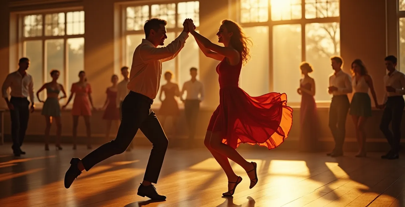L’image vous fascine : des couples qui tourbillonnent avec une énergie communicative sur une musique jazz entraînante. Vous vous dites : « J’adorerais savoir faire ça ». Puis, immédiatement, le doute s’installe. Par où commencer ? Cours à l’année, stage intensif ? Et si je suis ridicule ? Si je n’ai pas le rythme ? Cette avalanche de questions paralyse souvent l’envie avant même le premier pas. Face à cette jungle, le conseil habituel se résume souvent à une platitude : « il suffit de se lancer ». Mais cette injonction au courage ignore la peur légitime de l’inconnu, le spectre de l’abandon après quelques semaines et la croyance tenace qu’il faudrait un « don » pour la danse.